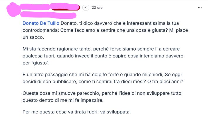 La sia risposta é stata importante ed ho deciso di scrivere di questo, piuttosto che la solita newsletter, pensando che possa aiutare altre persone in una fase di blocco. Intanto vi faccio vedere la sua risposta: