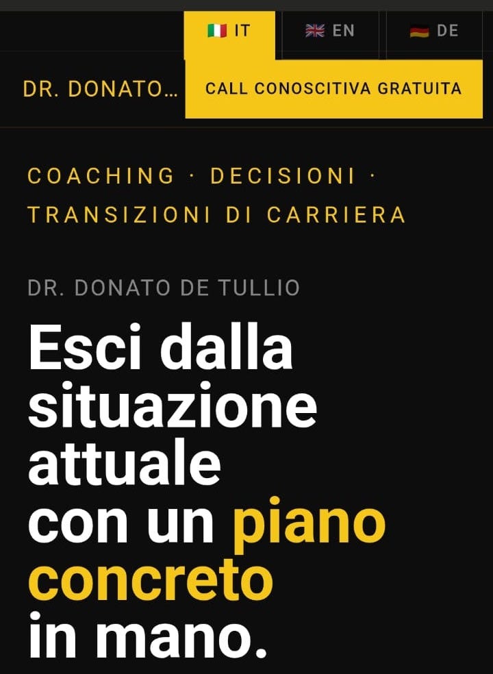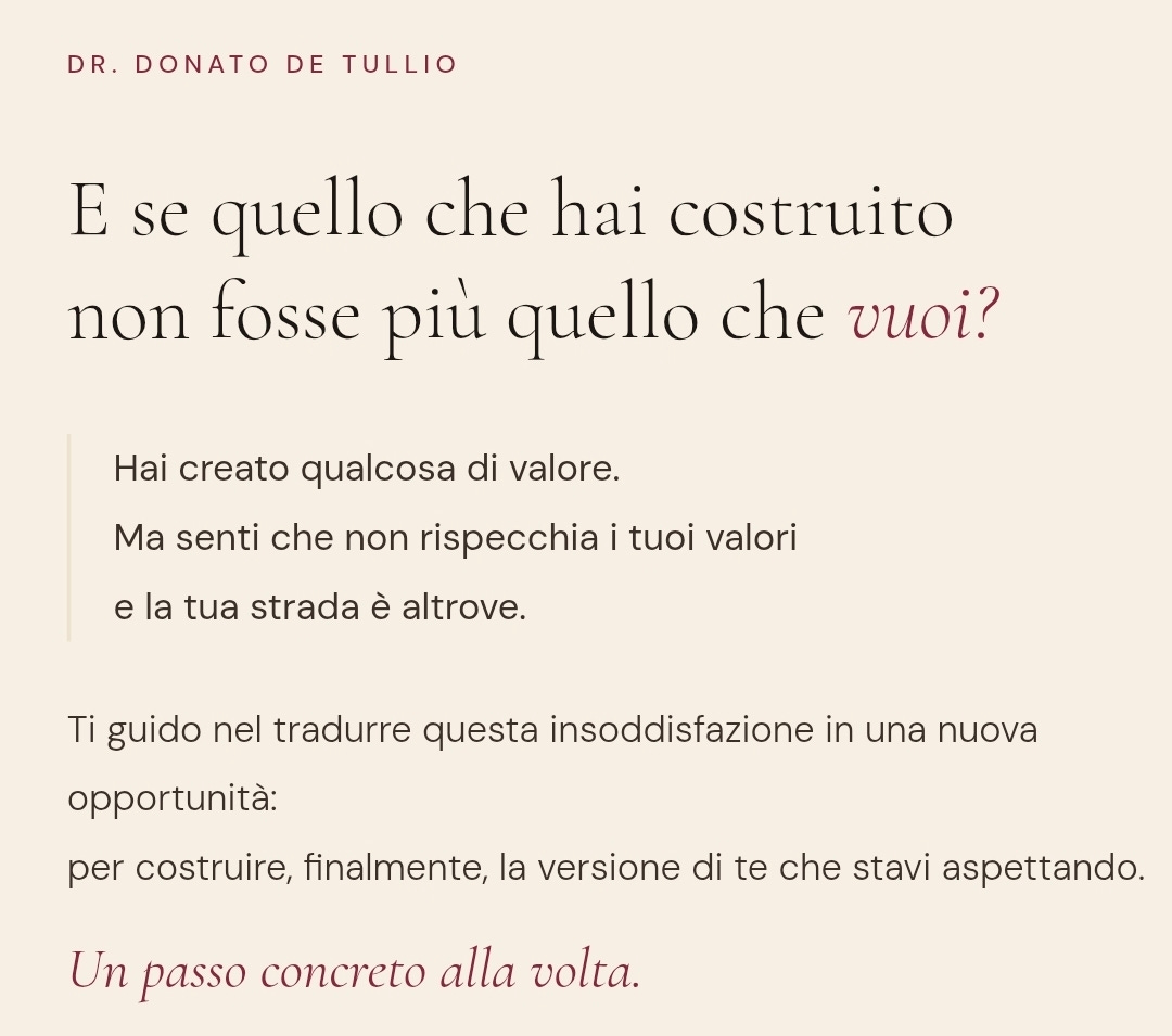 Ci siamo sentiti e mi ha distrutto il sito con poche parole: “Donato, senza offesa, ma questo sembra il sito di un idraulico. Uno che vende tutto e niente. Entri e vieni preso a schiaffi da una landing page aggressiva. Chi ti cerca vuole fiducia, vuole sentirsi capito, non vuole sentirsi vendere un tubo di gomma.” (ho addolcito!)